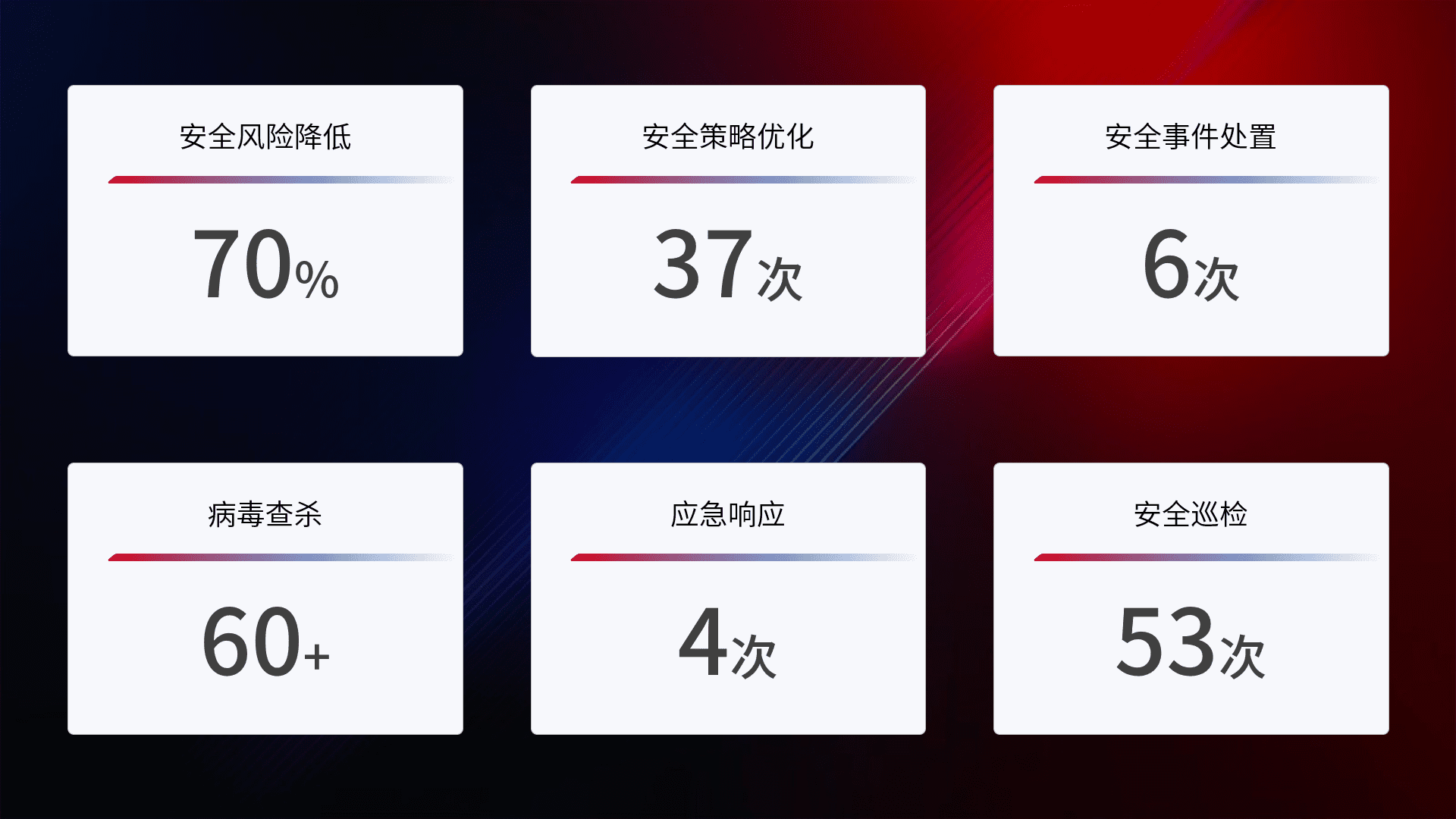 提供全面的安全事件报告体系,,,包括处置报告、、周报、、、季度和年度总结,,结合持续监控,,帮助客户深入了解网络安全状况。。。
